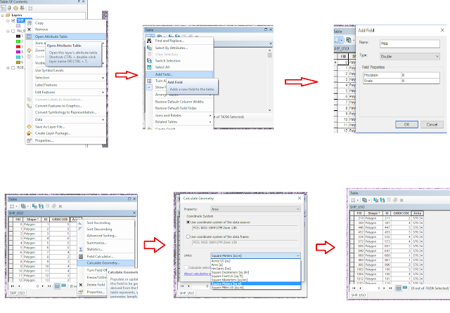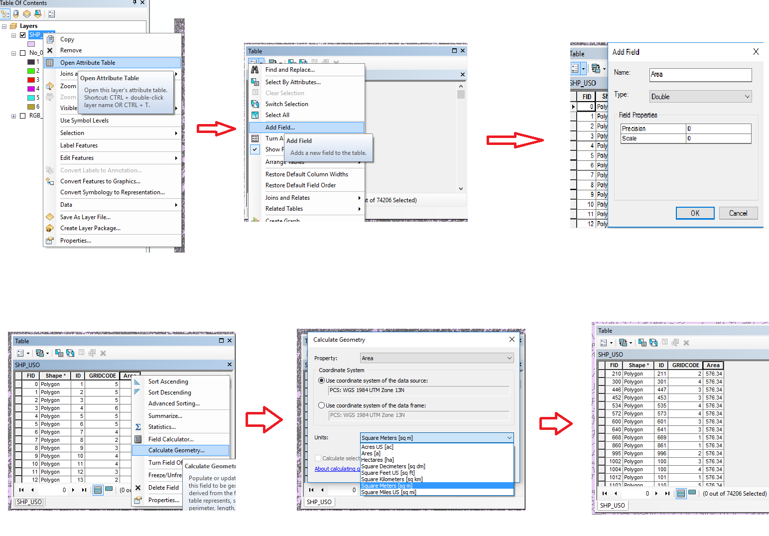 1.- Abrimos la tabla de atributos, haciendo click derecho sobre el titulo del SHP, después Add Field en dَnde indicaremos el nombre del atributo, Type como "doble" y precisiَn y escala dejamos en 0. Una vez creado este campo, daremos click derecho en el nombre del campo recien creado y le indicamos que deseamos "Calculate geometry", una vez en la nueva ventana sَlo deberemos indicar que queremos determinar un لrea, dejando la proyecciَn que ha detectado pro default y la unidad de medida, que serل m2.