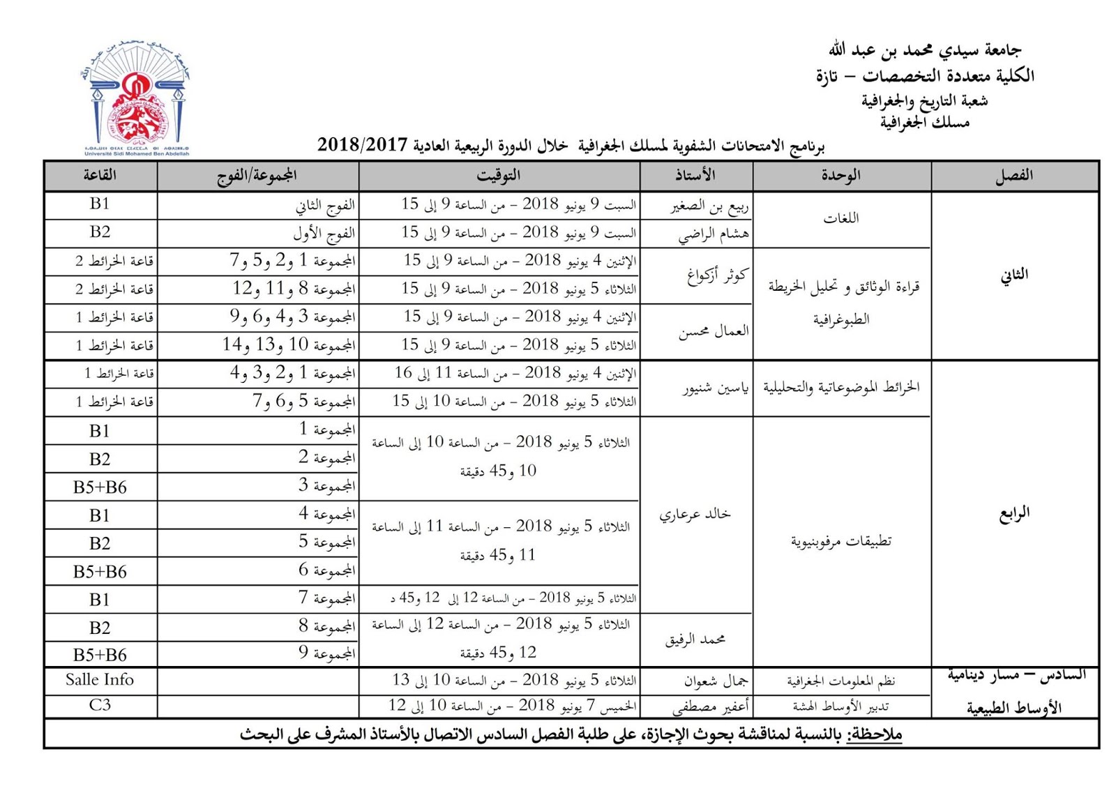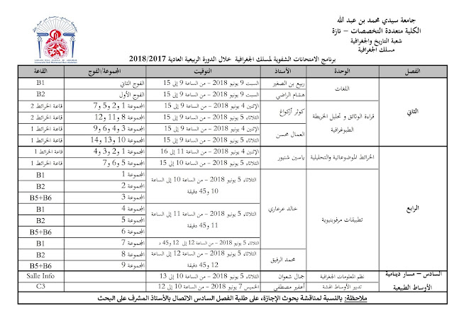 فيما يلي برنامج الامتحانات الشفوية للدورة العادية الخاصة بمسلك الجغرافيا بالكلية متعددة التخصصات تازة الموسم الجامعي 2017-2018 مسلك الجغرافيا 2018 أكثر...