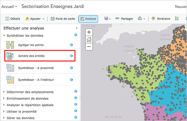 - Cliquer ensuite sur la commande "Analyse" puis sélectionner l'outil "Joindre des entités".