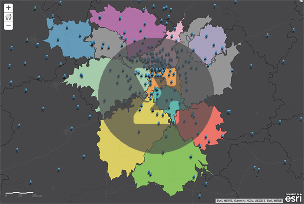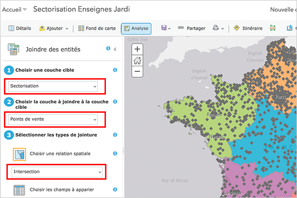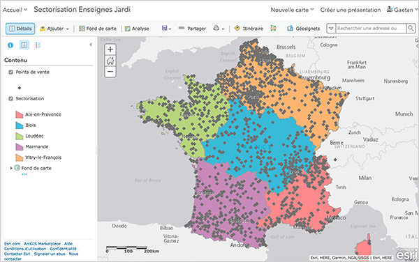 - Ouvrir la carte web contenant les deux couches à combiner. Ici la couche de la sectorisation commerciale et une couche de polygones et la couche des points de vente est une couche d'entités ponctuelles.
