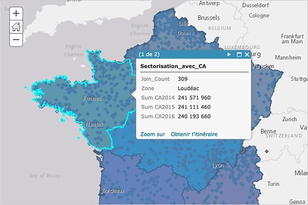 Cliquer sur le bouton "Exécuter l'analyse" pour lancer le traitement. - Une fois l'analyse terminée, la couche résultat est automatiquement ajoutée dans la carte. Celle-ci contient les attributs d'origine de la couche des secteurs commerciaux ainsi que les chiffres d'affaires agrégés depuis les points de vente intersectant chaque secteur.