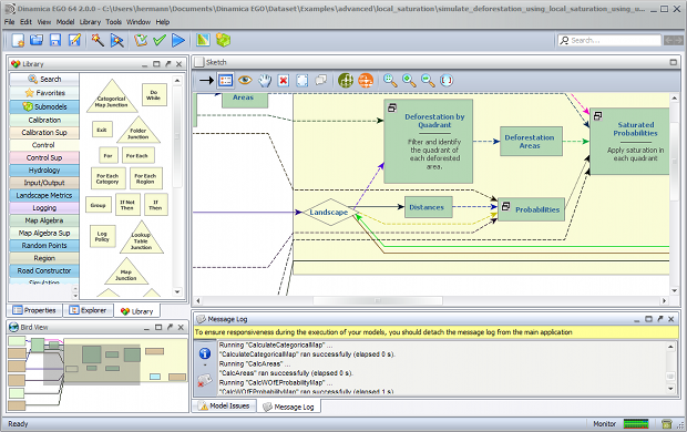 Dinamica EGO consists of a sophisticated platform for environmental modeling with outstanding possibilities for the design from the very simple static spatial model to very complex dynamic ones, which can ultimately involve nested iterations, multi-transitions, dynamic feedbacks, multi-region and multi-scale approach, decision processes for bifurcating and joining execution pipelines, and a series of complex spatial algorithms for the analysis and simulation of space-time phenomena.
