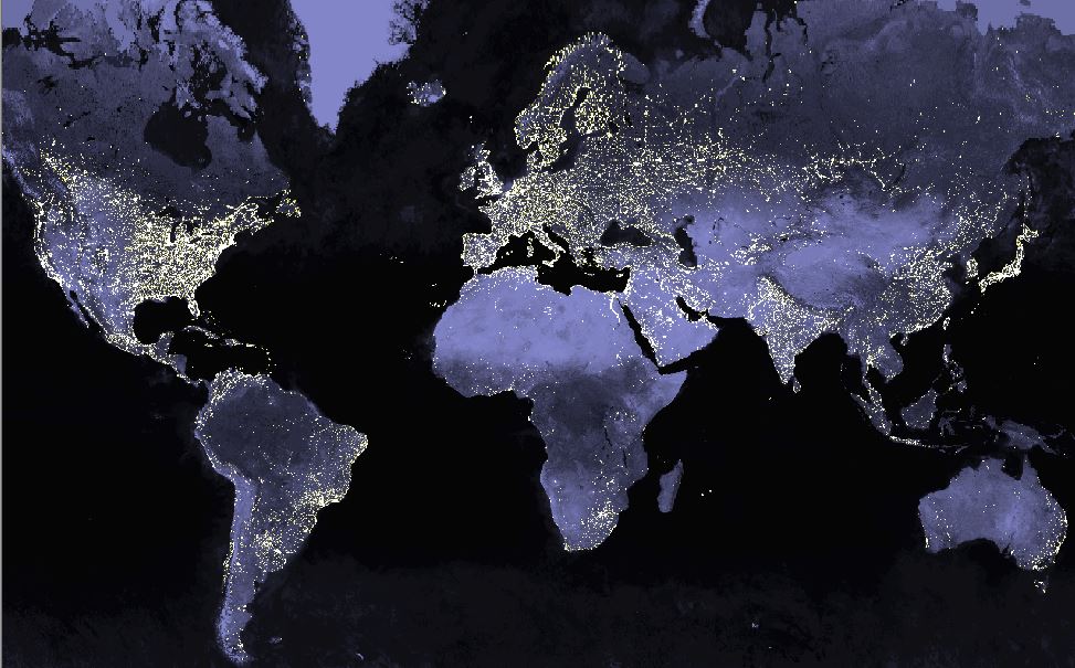 This layer presents a nighttime view of the Earth that provides an informational and educational view of our planet at night. The image was produced by mosaicking Defense Meteorlogical Satellite Program (DMSP) Operational Linescan System (OLS) satellite images. This map presents the locations of permanent lights on the Earth's surface. These data are derived from 9 months of observations superimposed on a darkened land surface. ESRI georeferenced these data to a real-world coordinate system. The layer is suitable for display to a largest scale of 1:18,500,000.