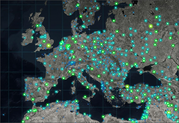 Ci-dessous, cette cartographie utilise le fond de carte Firefly pour y afficher les principales villes du monde en fonction de leur rang en terme de population. Le fond d'imagerie étant désaturé, l'utilisation de symboles ponctuelles de type "néon" est encore plus efficace qu'avec le fond d'imagerie classique.