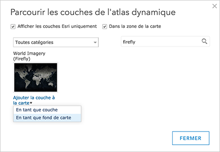 2. Rechercher ensuite (dans les couches Esri uniquement) la couche à l'aide du mot-clé "firefly".