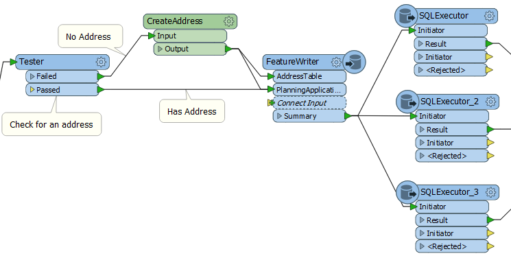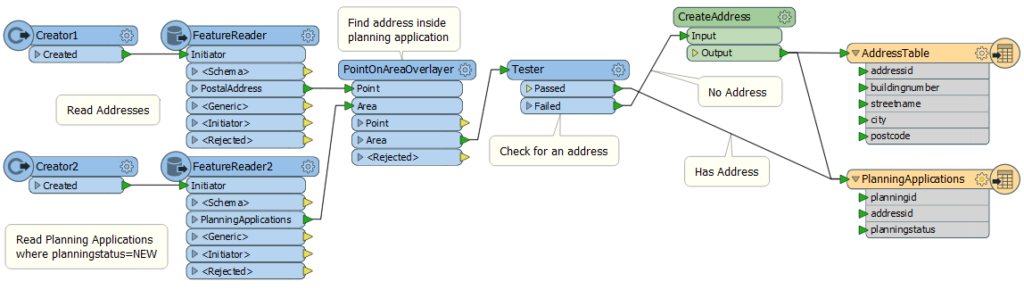 First I’ll explain what it does.*Basically it reads new planning applications (i.e. polygons on which development will take place) from a CAD file and writes them to a corporate database. It also determines which address is associated with each*application by doing a point-in-polygon test (PointOnAreaOverlayer transformer). If no address falls inside the planning application, then one is created and added to the address table.