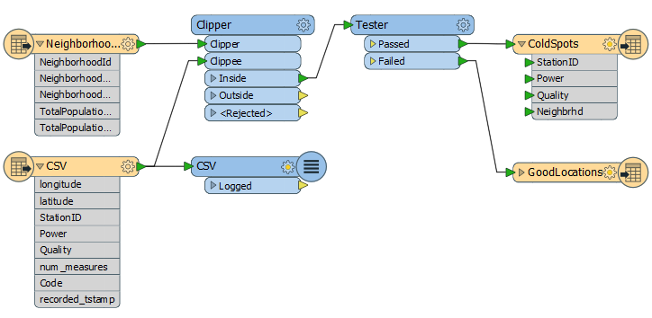In the workspace screenshot above you might have noticed that we’re finding the neighborhood of every cell phone record, but we’re only writing out the neighborhood attribute to the low signal dataset.