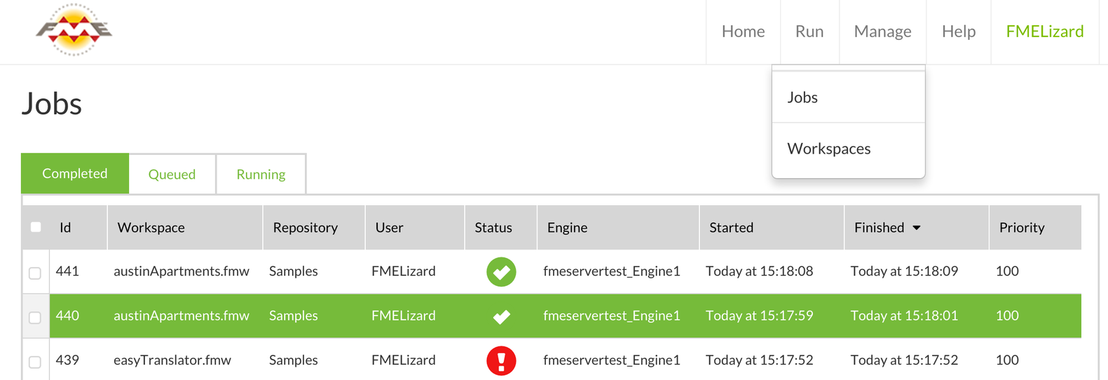 What I’m most excited about is something more primitive: running jobs. You told us this is one of your most common interactions with FME Server. Other common interactions are publishing and checking job status. So we added cool new stuff the the homepage of FME Server.
