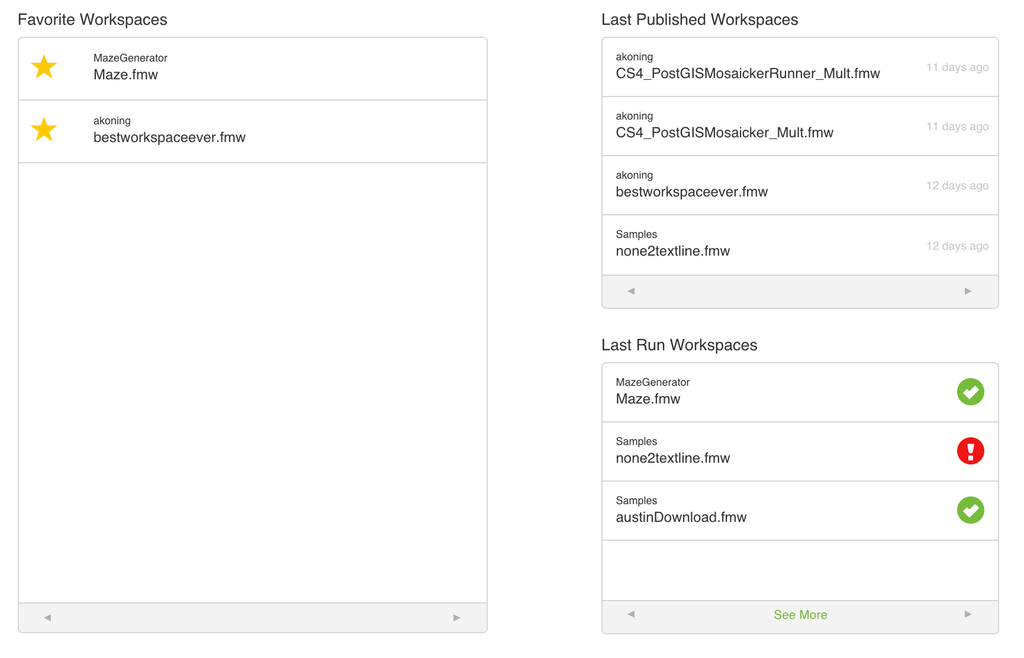 The homepage is now useful for getting to your most common tasks and information faster. You can quickly access recently published workspaces and recently run jobs for the user account you logged in with. You can also favorite workspaces, as there are bound to be some workspaces you run more often than others.