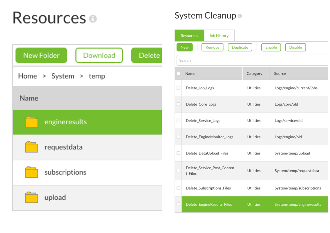 We have moved all temporary datasets to a new Resource directory called System and added System Cleanup tasks. Every temporary file cleanup task is now configured through the Web UI.