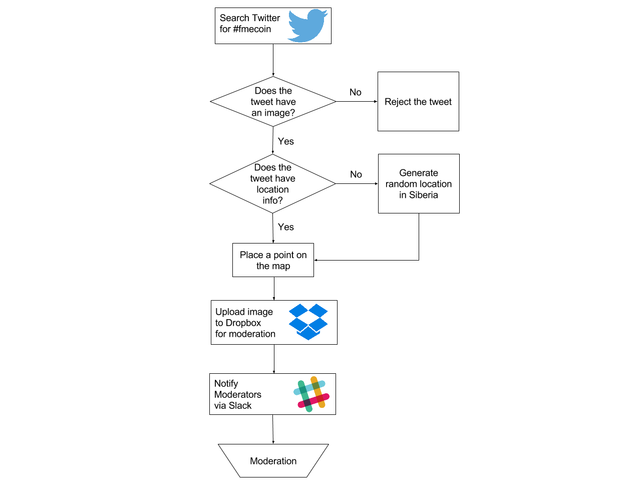 The workflow is split into two automated processes with a manual step in the middle. We scan Twitter for the #FMEcoin hashtag, and if a tweet has an image, we add a record to the PhotoSubmission Google Fusion table and download the image to Dropbox for moderation.
