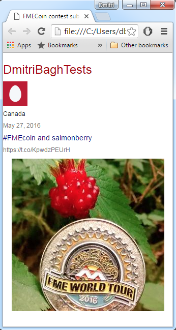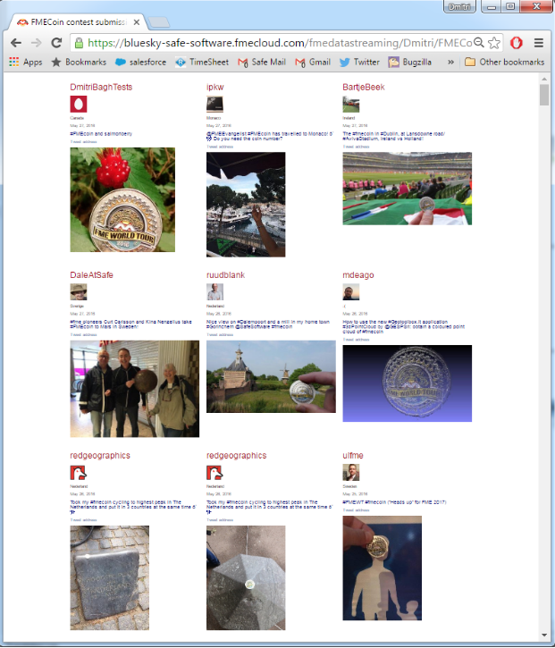 This page is dynamic — in fact, it is a workspace hosted on FME Cloud that stream the freshest contents of our approved submissions database into your browser, grabbing images from my Dropbox and Twitter profile image repository.