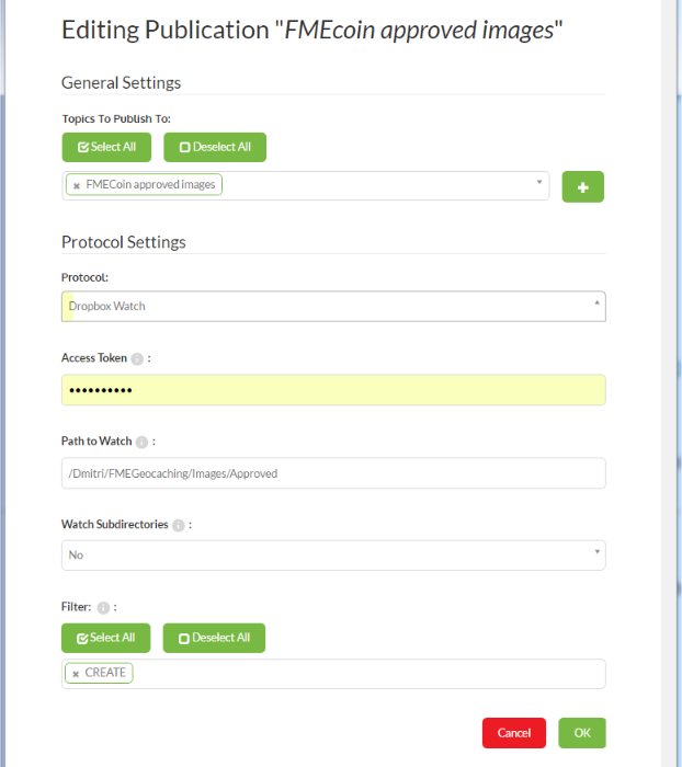 I also created a subscription for this publication, which runs every time the Approved folder receives a new entry. The subscription runs the second workspace that moves the approved images to Archived and Published Dropbox folder and inserts a record into Approved Google Fusion table.