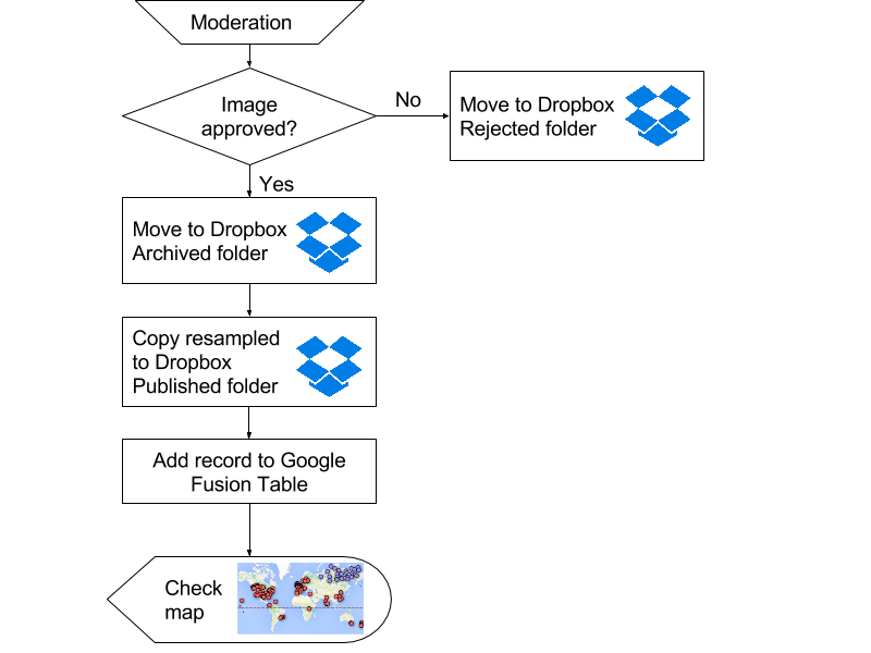 The files from “Approved” folder automatically go to “Archived” folder and the downsized versions are placed into “Published” folder. These are the images that we use on the map and on the report page. DropboxConnector lists all new submissions, copies files to new folders, and deletes the processed files. In this workflow, DropboxConnector is our main tool for physical manipulations with the files.