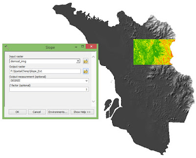 Output slope mengikut sempadan polygonContoh yang saya tunjuk ni menggunakan tool Slope, tapi sebenarnya Environment Settings ni anda boleh apply pada mana-mana tool dalam ArcToolbox sebenarnya. Hopefully anda dapat idea sikit-sikit. Selamat mencuba.