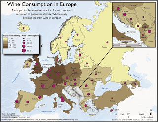 In the Choropleth and Proportional Symbol Mapping lab students were tasked with presenting European population density and wine consumption per capita on one map.