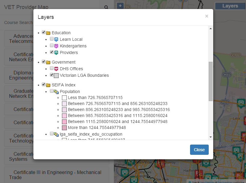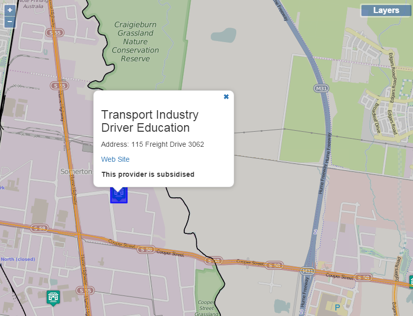 The VET provider map allows people to look for Vocational Education and Training (VET) providers in the state of Victoria. With this map, people can search for: