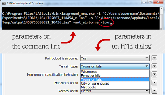 Using a tool on the command line vs. using a tool as part of an FME workflow.