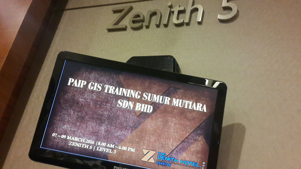 Kursus ni telah berlangsung pada 7 hingga 9 Mac 2016 di Hotel Zenith Kuantan. Silibus kursus merangkumi beberapa topik di dalam kursus ArcGIS Desktop dan juga topik2 di dalam kursus Geodatabase. Untuk memudahkan pemahaman peserta, tutorial kursus diubahsuai menggunakan contoh-contoh data PAIP.