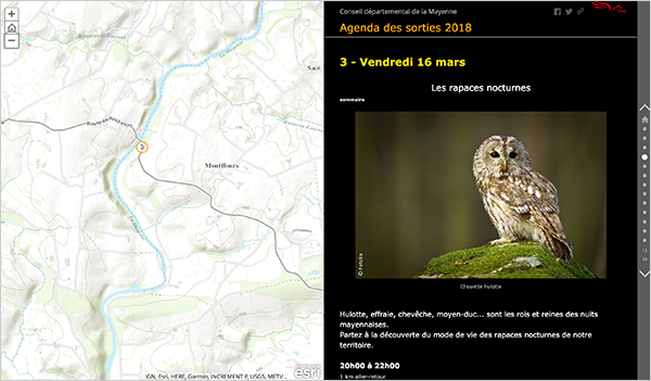 Réalisée à l'aide du modèle d'application Story Map Journal, l'application permet de dérouler l'agenda des 30 sorties programmées par le département et de découvrir les lieux, l'écosystème et les spécificités du site visité.