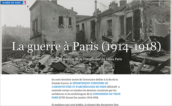 Cette année 2018 marque le centenaire de la fin de la Grande Guerre. Le département d'histoire de l'archéologie de Paris (DHAAP) a souhaité mettre en lumière les dossiers constitués par les architectes et les archéologues de la Commission du Vieux Paris (CVP créée en 1897) durant les années 1914-1918. Pour cela, la Mairie de Paris a mis en ligne cette narration cartographique que j'ai retenu cette semaine.
