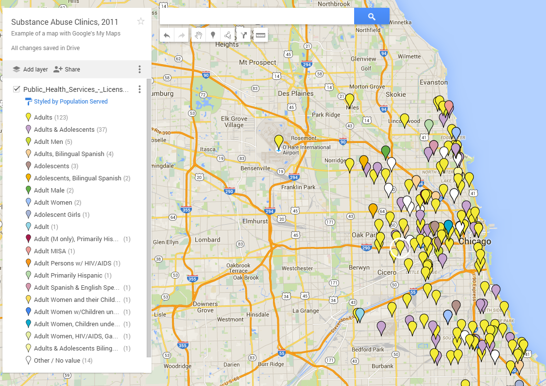 Google created a very user friendly way for users to make online maps from Google Drive.There are nine different basemaps to choose from. Adding layers is easy. Simply, click the link "Import" to add data or "Add Layer" to add additional layers on top or below. You can add *.csv, *.xlsx, or *.kml files. You can directly import files by searching your Drive or import them from your desktop. If you use a spreadsheet, Google will prompt you to identify the location field or field(s) whether an address or placename as well as how to identify/name your features.