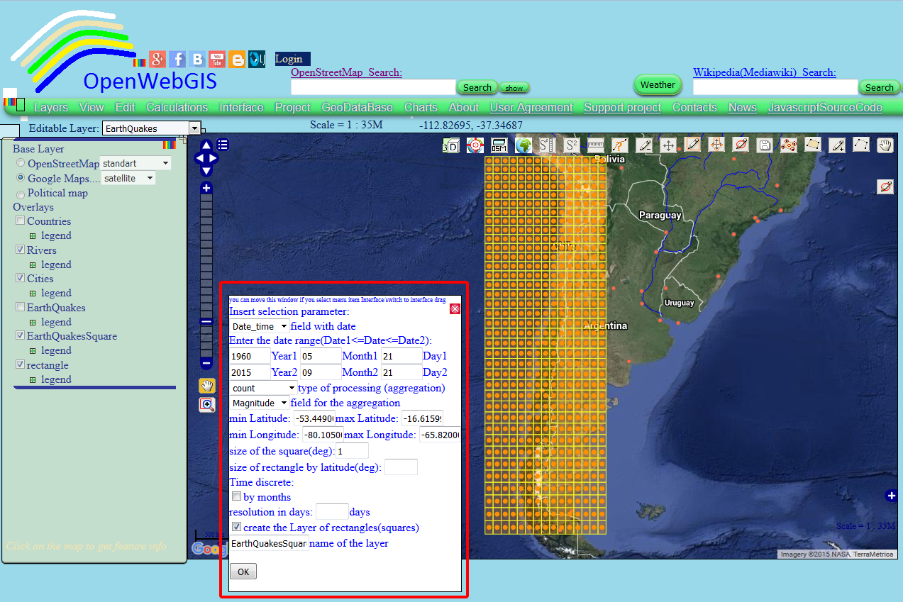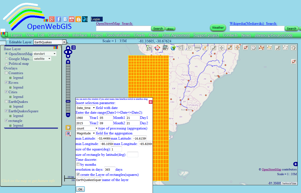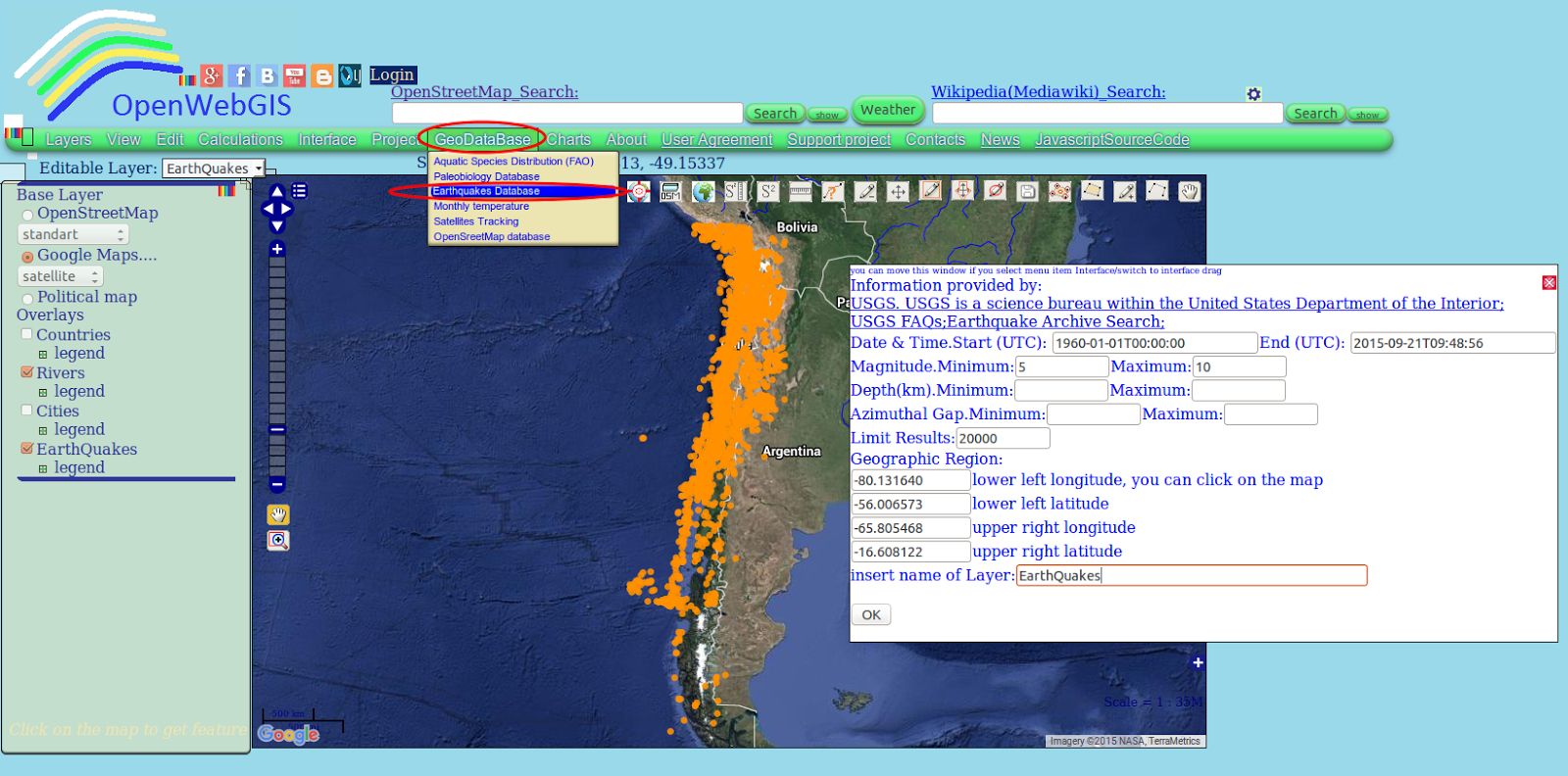 Initial data on earthquakes was choosen from the database of "Earthquake Archive Search" with the help of menu item in OpenWebGIS: "GeoDataBase-> Earthquakes Database".