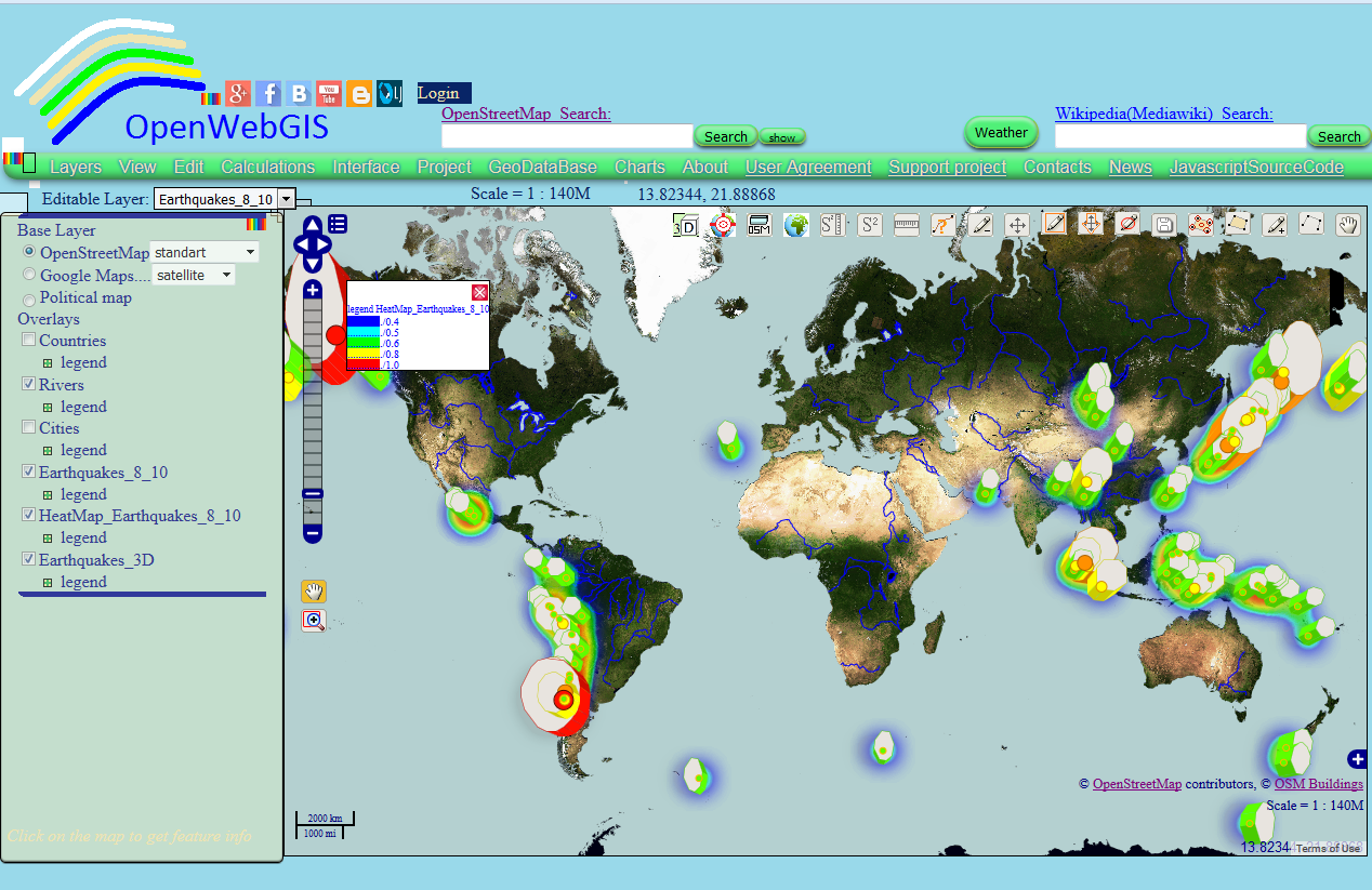 <div style="text-align: justify;">Look at the interesting map of the most destructive earthquakes (with magnitude of 8 to 10 values) from 1905 to 2014. The data for this map was taken from USGS. USGS is a science bureau within the United States Department of the Interior. It can be available with menu item of OpenWebGIS: "GeoDataBase-> Earthquakes Database".