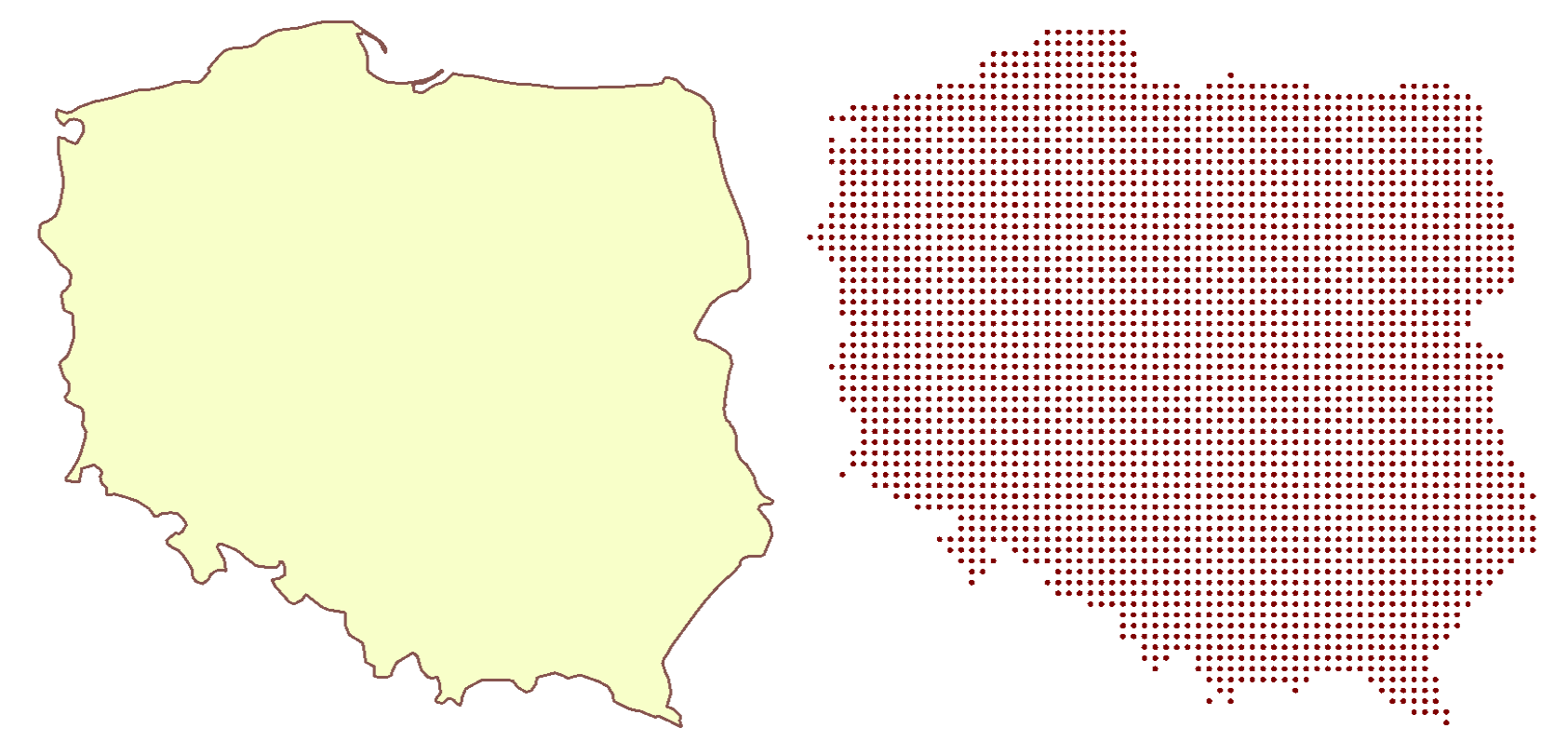 While I was working on this article, I decided to re-evaluate my approach to polygon creation, and found a more elegant solution, which also involves more geometry types – I decided to rasterize the multipoints. Raster cells always have some size, and if we set that size to the spacing used for making the point cloud, we will fill all the gaps between the pieces.