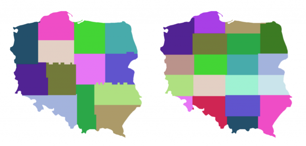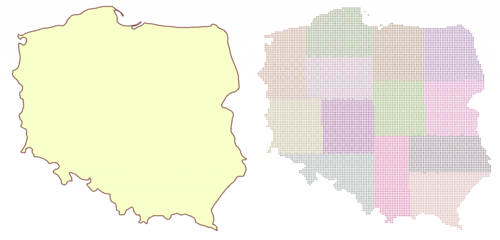 Depending on the splitting mode, we can get different results. “Spatial Equal Points Multipoints” mode produces areas with less variation in their sizes, and “Nested Equal Area Multipoints” makes better shapes.