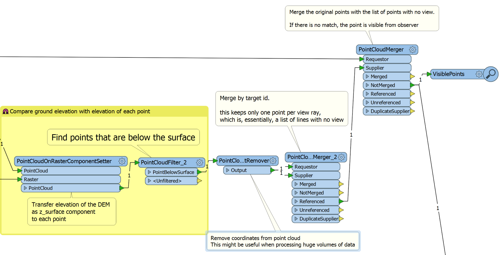 FME Workspace that overlays the DEM on the visibility ray point cloud and outputs the visible points.