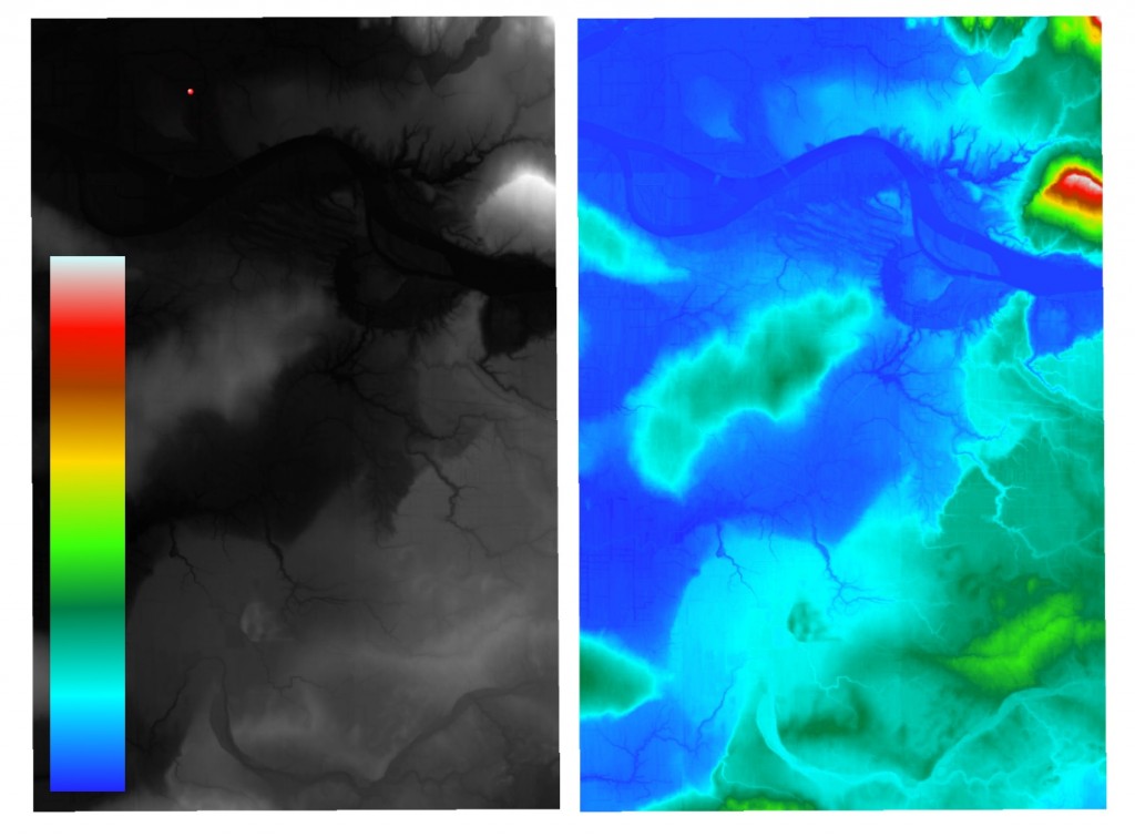 PointCloudOnRasterComponentSetter brings RGB values from the ramp to the points of the DEM, and PointCloudComponentCopier restores the original XYZ values. Now if we rasterize our point cloud, we will get a nicely colored RGB raster (the original is on the left along with the color ramp, the result of the coloring is on the right):