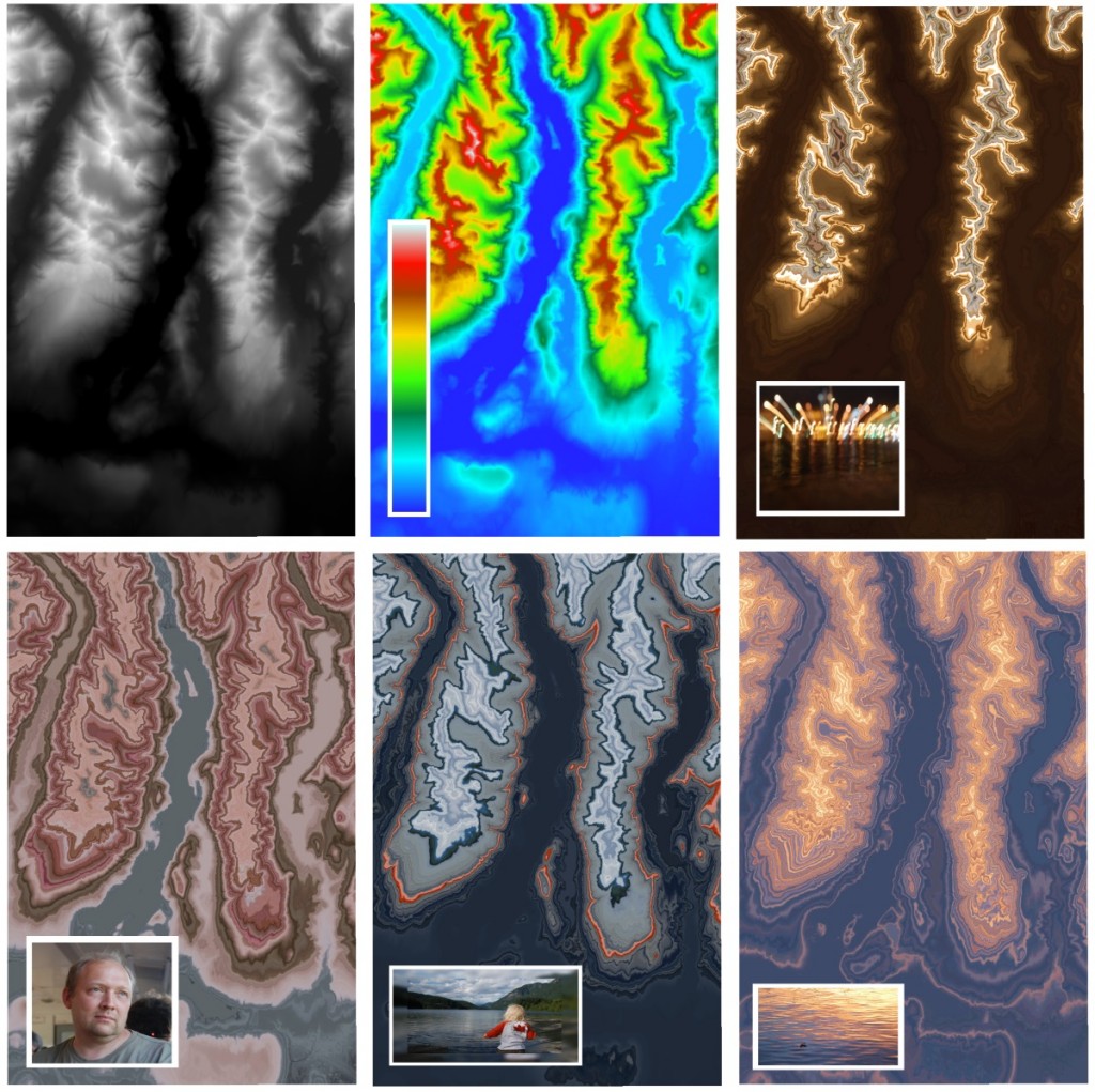Original raster (top left) and several outputs using various images as a color ramp.Download example.