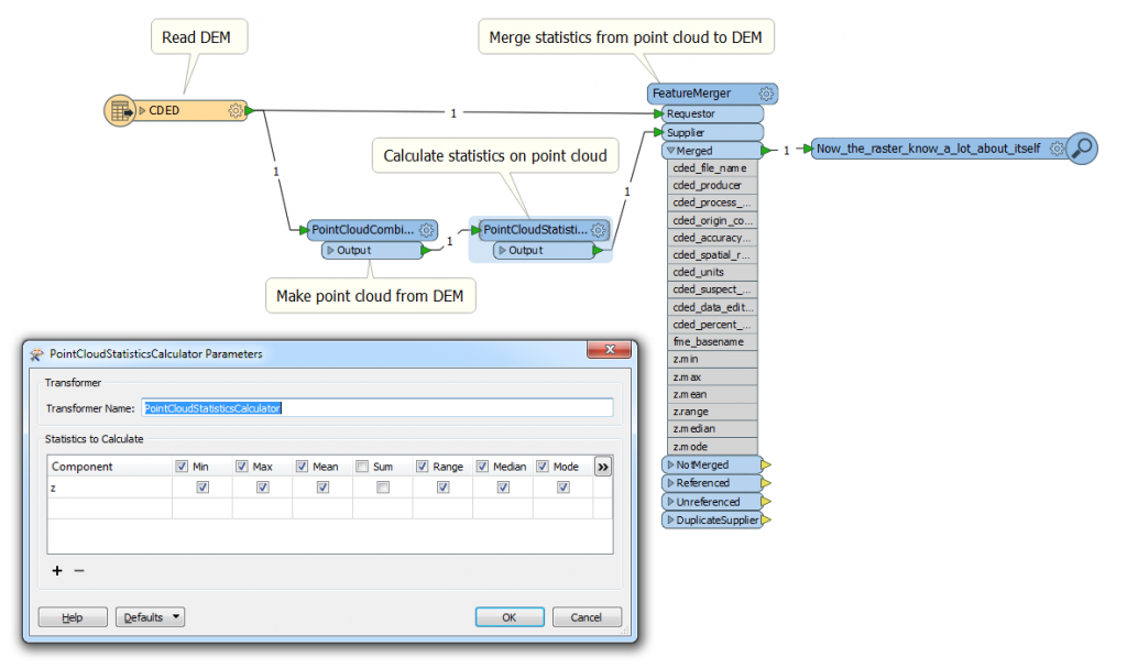 Calculating raster statistics using FME’s PointCloudStatisticsCalculator.Once the statistics are calculated, we can merge the statistical attributes back with the original raster or process them separately.