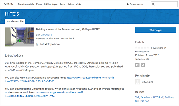 L'étape suivante consiste tout simplement à télécharger le fichier 3VR dans les contenus de votre portail ArcGIS Online. Il apparait alors en tant qu'élément de type "360 VR Experience" et peut être ouvert par l'application ArcGIS 360 VR.
