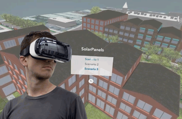 A l'aide de son casque (Samsung Gear VR) et de l'application ArcGIS 360 VR, l'utilisateur final peut accéder à la scène 3D, parcourir les différents points de vue et afficher les scenarii. Ci-dessous, une capture vidéo reconstituant la vision binoculaire et l'interface d'ArcGIS 360 VR sur le projet CityEngine utilisé ci-dessus pour cet article.