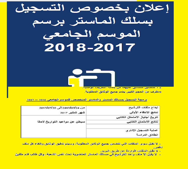 إعلان التسجيل بسلك الماستر برسم الموسم الجامعي 2017-2018 كلية الآداب والعلوم الانسانية سايس فاس مزيدا من المعلومات https://docs.google.com/viewerng/viewer?url=http://www.fls.usmba.ac.ma/wp-content/uploads/2017/07/isn-master.pdf&hl=en...