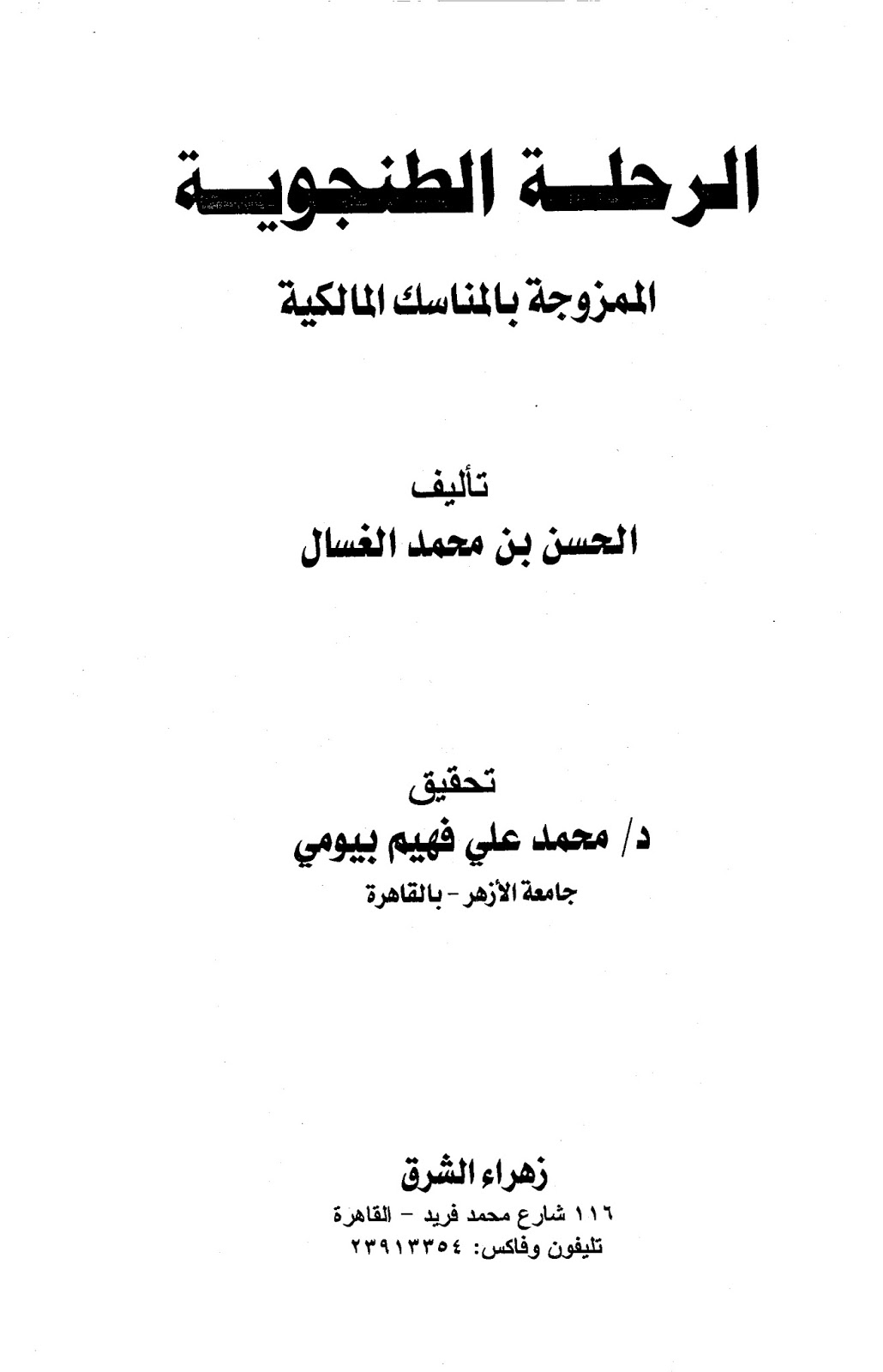 الرحلة الطنجوية الممزوجة بالمناسك المالكيةلأول مرة مصورا الكتاب: الرحلة الطنجوية الممزوجة بالمناسك المالكية المؤلف: الحسن بن محمد الغسال تحقيق: محمد علي فهيم بيومي عدد الصفحات: 232 الطبعة: الأولى - 2009م الناشر: زهراء الشرق - القاهرة الرابط...