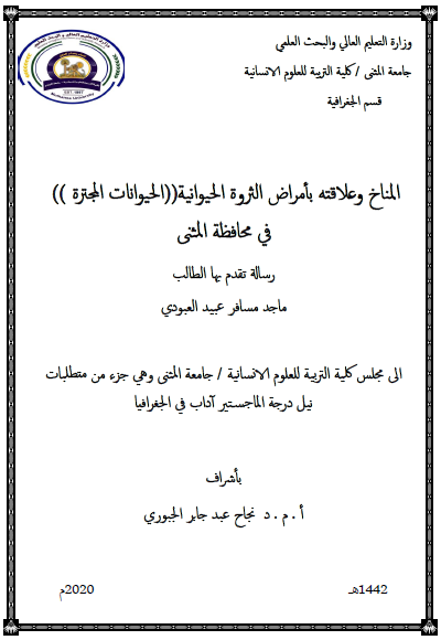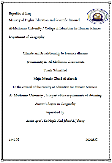 المناخ وعلاقته بأمراض الثروة الحيوانية (الحيوانات المجترة) في محافظة المثنى رسالة تقدم بها الطالب ماجد مسافر عبيد العبودي إلى مجلس كلية التربية للعلم الإنسانية / جامعة المثنى وهي جزء من متطلبات نيل درجة الماجستير آداب في الجغرافيا...
