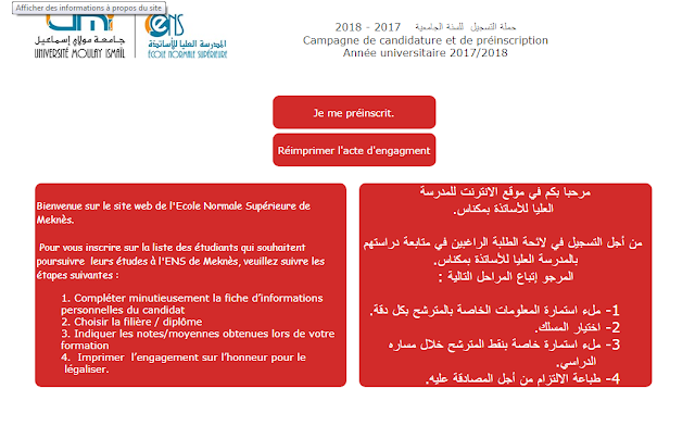 للتسجيل القبلي اضغط هنا http://inscriptionensmeknes.com/FR/