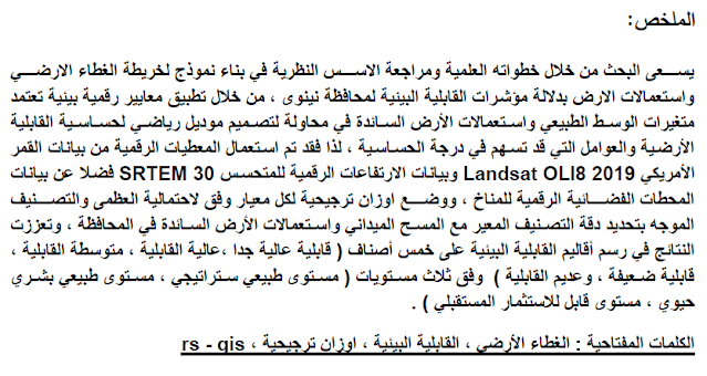 [h=1]نمذجة خريطة الغطاء الأرضي وفق مؤشرات القابلية البيئية لمحافظة نينوى [/h]