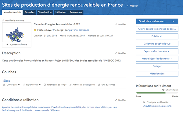 1. Connectez-vous à votre portail ArcGIS puis affichez la description de l'élément dont vous souhaitez préciser le statut.