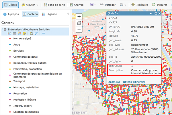 Dans notre exemple, pour les 20 692 commerces de Villeurbanne, la description du code de nature d'activité est maintenant intégré à la couche.