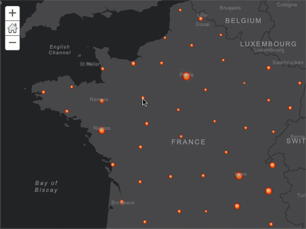 3. Le rendu de votre couche bascule automatiquement en mode "clustering". Le symbole de la couche est conservé mais sa taille est modifiée en fonction du nombre d'entités présentes dans chaque grappe de points. Le calcul de ces grappes est dynamique, ils sont actualisés à chaque changement d'étendue de la carte.