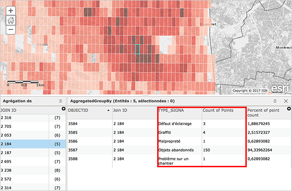 - Si vous affichez la table attributaire de la couche de grille, vous constatez que le dernier champ permet d'accéder aux enregistrements d'une table reliée. En effet, en ayant choisi de réaliser des statistiques de regroupement, l'outil d'analyse a également créé une table reliée à la couche de la grille. Cette table reliée contient, pour chaque maille de la grille, les statistiques sur les différentes valeurs du champ de regroupement. Ainsi une maille regroupant 5 points, aura entre 1 et 5 enregistrement relié selon les différents types de signalements qui auront été regroupés.