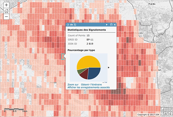 - Grâce à cette table reliée, il est ainsi possible d'ajouter des infographies dans la fenêtre contextuel pour présenter les statistiques calculées comme les effectifs ou les pourcentages par type. C'est d'ailleurs ce que fait automatiquement l'outil d'analyse sur la couche de grille résultante. En cliquant sur une maille vous pourrez visualiser ces infos.
