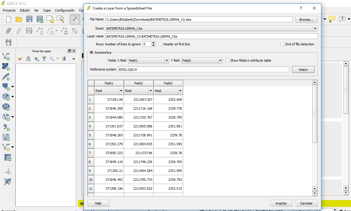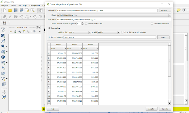 Ahora en la ventana emergente sólo agregar tu tabla SCV ( es prudente la conversión EXCEL -> CSV), indicas que estás trabajando con Coordenadas GMS, en Longitud y Latitud, aceptar.