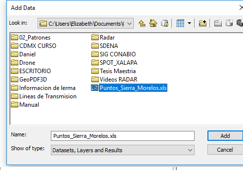 Para el caso de Arcgis, recuerda que el formato Excel te dará como resultado ERROR, por lo que debes convertir Excel 97-2003 o SCV, no uses archivos .xlsx procura .xls . La forma de agregar la información es igual en la que agregas un shp o un raster.