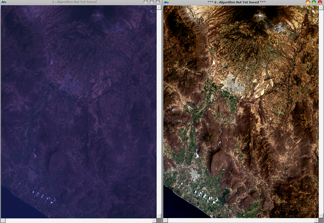 ¡Listo! tú imagen esta corregida, el cambio podrá ser muy visible o no, eso dependerá de la escena, pero más que visible, el cambio estará en los valores que cada pixel tiene, tus resultados serán más precisos por ejemplo en el cálculo del NDVI. Recuerda que este método es mediante DOS 1 o método Chavez y que es proceso rápido. Podrás comprar tus resultados con otros desde los valores espectrales de tu imagen con respecto al de la misma escena procesada con ENVI, ERDAS, IDRISI o qGis.