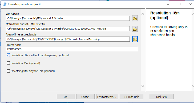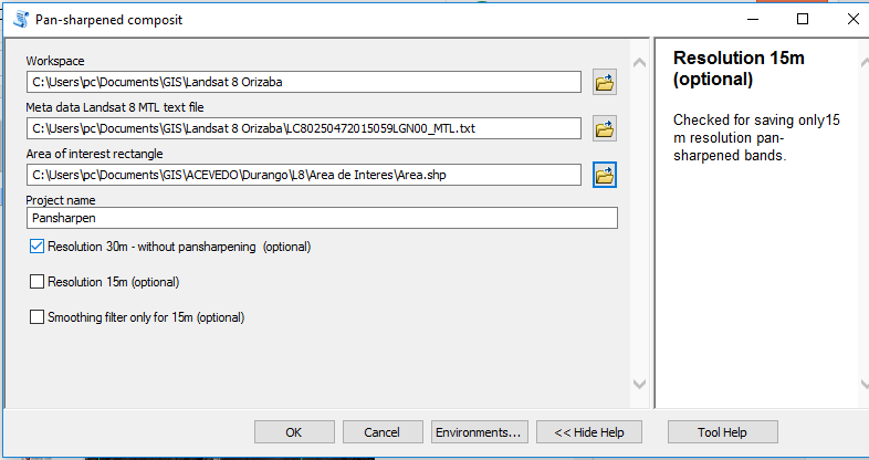 3.- Para poder realizar el podrecimiento tendrás primero que aplicar la herramienta de PANSHARPEN, qué no es otra cosa más que fusionar la banda pancromática con el resto, para darle una mejor calidad visual, ojo sólo será visual, la calidad del pixel en multiespectral seguirá siendo la misma, yo prefiero no hacerlo ( Yo hago click en 30 metros, pero puedes usar la opción 15 metros). Para ello sólo tendrás que indicar en workspace en dónde están tus bandas satelitales, es decir tu carpeta de Landsat 8. en Meta Data Landsat 8 MTL Tex File, le indicarás en dónde esta tu archivo de texto(metadatos) que viene junto con tus bandas, es decir en la misma carpeta del paso pasado buscar el TXT, a veces no aparece, por lo que tendrás que abrirla con tu bloc de notas y guardar una copia, después de ello aparecen los dos txt podrás tomar el que quieras. En Área de interés debes crear un shapefile del área que quieres corregir puede ser un área pequeña si estás en fase experimental o toda la escena pero tardará bastantes minutos o hasta horas. Project Name otorgas el nombre del archivo, este puede ser cualquier nombre,